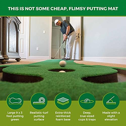 Little Details That Create A Perfect Putting Experience: Since this golf putting matt for indoors is created by a teaching pro, no detail was overlooked; It’s large, measuring 9 x 3 feet, and equipped with thick, durable foam; It has a slight uphill elevation and the cups are deep and true-to-size so the ball won’t pop out