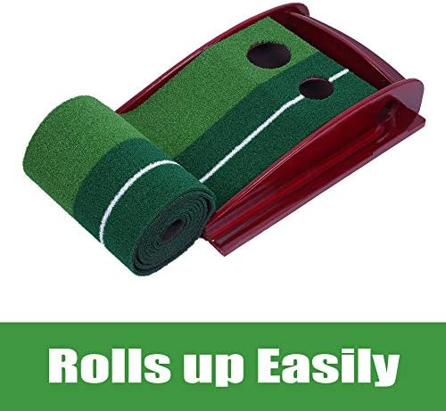 ★【Auto Ball Return System With Baffle Plate】The golf putting mat with Auto Ball Return System,when the ball into the hole ,it will automatically return to the mat through the return track,once the ball crosses the hole, the ball will be bounced back onto the mat by the plate baffle.So you can stand still at the end of the putting green and have no need to move your body to fetch the ball.it can save you more time when you practice the golf.