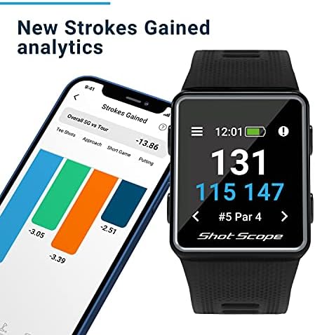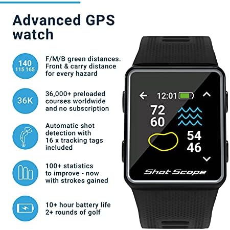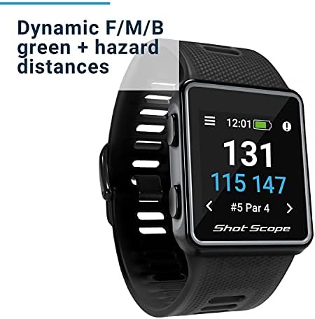 Shot Scope V3 GPS Watch – F/M/B + Hazard Distances – Automatic Shot Tracking – iOS and Android Apps – 100+ Statistics, Including Strokes Gained – 36,000+ Pre-Loaded Courses – No Subscriptions