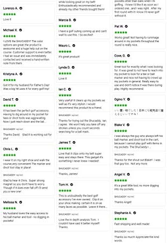 While we can all agree that there is way more to golfing than simply whacking a ball a certain distance, golf certainly shouldn’t include getting poked by your golf tees or having to hunt through your pockets for an accessory that may or may not be there.The SHUCADDY 2.0 was designed to make your golf game easier and more enjoyable by allowing you to have your most common golf accessories right there at your fingertips.Clip your SHUCADDY anywhere that is most accessible for you, from your shoelaces to your golf bag, and experience a more streamlined game of golf without all of the hassle.You have talked and we have listened! The new and improved SHUCADDY 2.0 was redesigned with a reinforced stainless steel metal clip that is guaranteed not to break, allowing you to clip your SHUCADDY in more places.“I didn’t realize how much I’d use it” – Kevin KochFEATURES: Heavy duty canvas material for long-lasting durability. Polished iron divot tool for golf course repair. Built-in heavy-duty N50 magnet keeps ball marker in place for easy access. Quarter-sized polished iron ball marker w/ logo (can be easily swapped out with your favorite ball marker) Reinforced stainless steel clip designed to clip almost anywhere, including your shoelaces, belt, pocket, or golf bag and is guaranteed not to break. Two wood 2 ¾” golf tees. (2 ¾” is the recommended size to use, however it can fit everything except for wide body martini glass tees. Longer tees may poke you and shorter tees may be harder to access)FAQ’s:“What’s wrong with using your pockets?” Nothing, if you like getting poked in the thigh with a divot tool or tee. Or searching for a ball mark while people are waiting for you to get out of their line. “Its gonna be in my line of sight when I’m addressing the ball.” You might be right. That ball definitely went in the water because of a colorful shoe accessory. Get Yours. Get organized. Get Playing.