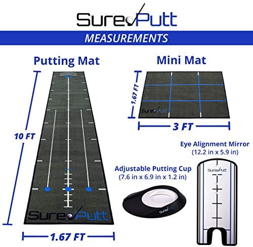 SurePutt Golf Putting Mat Indoor | Premium Practice Chipping and Putting Green | Eye Alignment Mirror, Putting Cup and Ball Liner Included | Complete Short Game Improvement System |Approx 10ft x 1.7ft