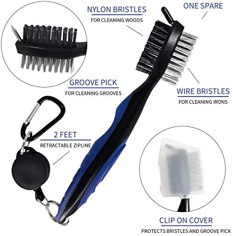 Retractable Golf Brush with protective cover: It has both wire and bristle sides also a spike on the end to clean club groove well.A plastic cover over The brush head to keep.safety.The retractable cable makes you can use the brush without unclipping it from golf bag.