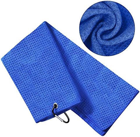 GOLF TOWEL:Tri-fold Microfiber with waffle design removes dirt, mud, sand and grass better than cotton towels. Size 16” x 21” with a heavy duty aluminum clip/carabiner that conveniently attaches to your golf bag.