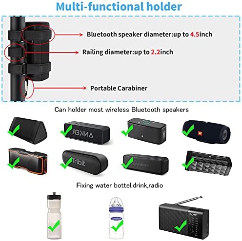 【Speaker Mount Size】Two long speaker strap can holder the wireless speakers with a circumference of 0-16 inches. Three short adjustable straps fits railings/bars circumference up to 6 inches.You can fixing some attachments like Speakers,Water bottle, golf accessories, drinks, tools, radio, clothes, etc to any railing.