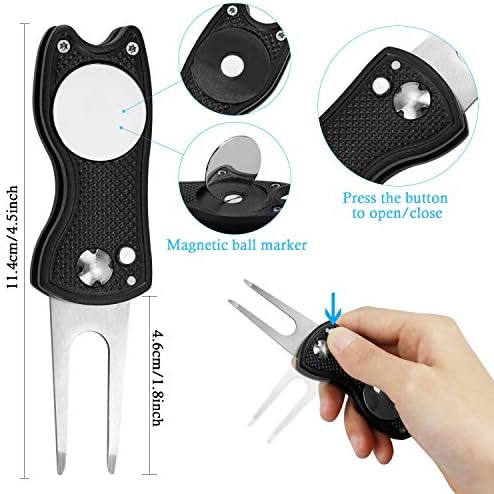 Golf Divot Tool: Magnet ball-marker that attaches to the divot tool, easy push down to pop and reseat; This foldable golf divot tool to avoid catch on your pocket or finger