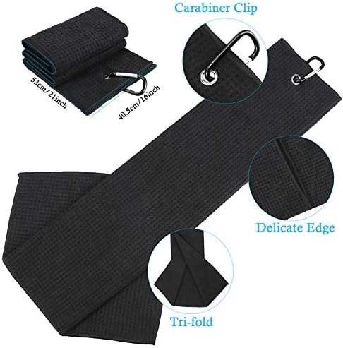 Golf Towel: Tri-fold of 16 x 21”, microfiber with waffle design removes dirt, mud, sand and grass; Aluminum clip/carabiner that conveniently attaches to your golf bag