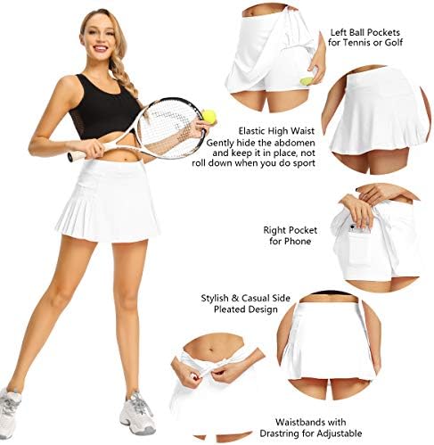 Skorts Skirts for Women With Pockets: This is a gorgeous well made skirt and shorts set. The shorts underneath are comfortable and have two pockets which is practical and convenient. One for storage of your essentials like phones, cards, keys, etc. Another upside down pocket can hold tennis golf balls.