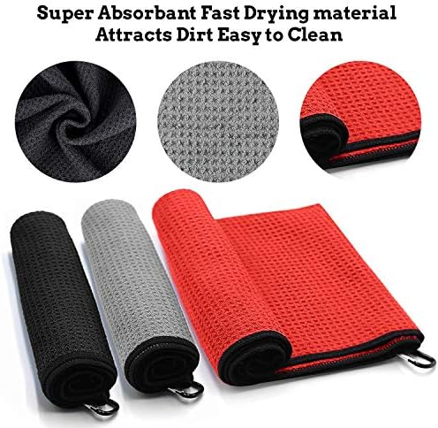 VALUE 3 PACK MICROFIBER GOLF TOWEL : Great size design to clip to your golf bag or your belt loop. 3 pack golf towels allow you always have one as a backup. Take it with you to the course, clean your golf ball before putting, clean your club after swings.