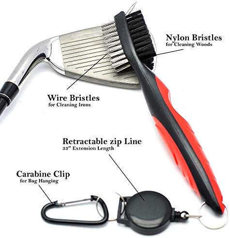 POWERFUL CLUB BRUSH : Extremely durable plastic handle, nylon bristles and aluminum carabiner.Retractable 2 ft. zip-line carabiner makes it easy to attach to your golf bag.Quick and efficient cleaning of irons while on the fairway, best cleaning tools for golf clubs and spikes, spike for cleaning deep in grooves and golf shoes.