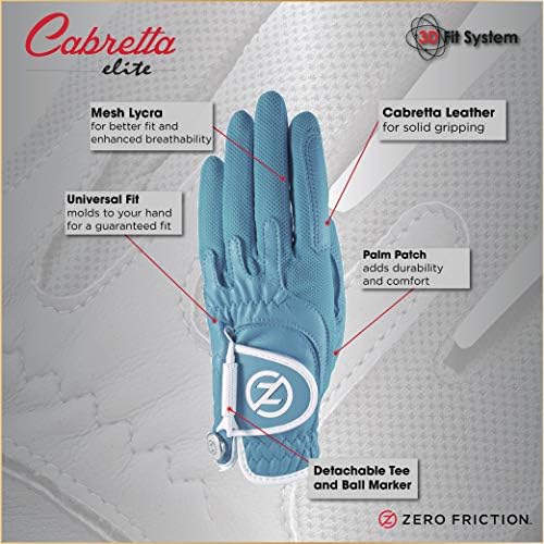 Every glove includes a detachable tee and ball Marker. Zero Friction unique compression-fit technology, 100% authentic cabarets leather glove gets a make-over with matching lira colors. The elite glove is crafted with reinforced lira throughout finger, back of hand & palm for maximum strength, durability and enhanced breathability. The luxurious cabarets leather gives every golfer the ultimate glove experience allowing for maximum grip in almost all elements.