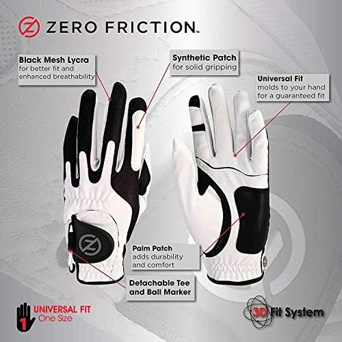 Take the guesswork out of finding the perfect size glove. Zero Friction’s Compression-Fit technology delivers outstanding precision, flexibility and comfort. All weather synthetic palm with a black color patch re-enforces the palm and adds durability. Smooth synthetic microfiber back, palm and fingers allow for maximum gripping. The glove come with a detachable tee and ball marker.