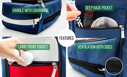 Winning combination of style and features. Large front opening, full length ventilation on both sides. Large deep pockets, both front and back, for small golf accessories. Carry handle with carabiner so you can easily clip to your golf bag.