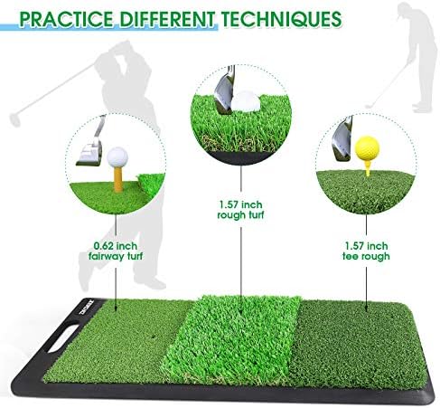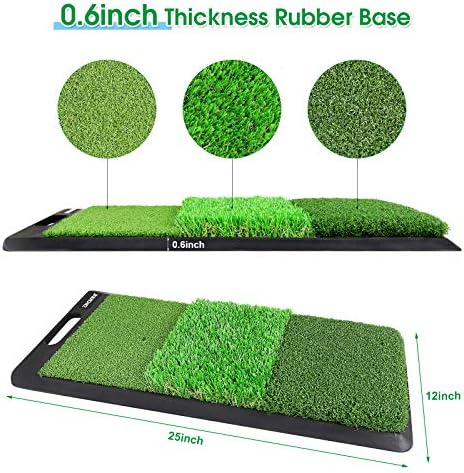 ⛳【3-In-1 Golf Hitting Mat】- This 25 x 12 inches golf hitting mat features 3 different turfs: 40mm tee turf, 40mm rough turf and 16mm fairway turf for chipping, driving and putting. You will surprise how fast your skill improve.