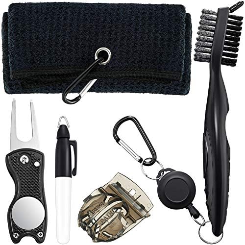 5 Pieces Golf Cleaning Tool Kit Includes Microfiber Waffle Pattern Golf Towel, Golf Brush, Golf Ball Liner, Golf Ball Marker Pen and Golf Divot Tool for Golf Accessories (Black)