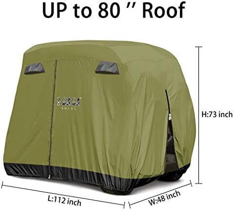 Golf Cart Covers 4 Passenger Fits Golf Carts with Full Roof 80″ Top (4 Passenger): A perfect fit for your cart, no matter your cart is EZGO, club car or Yamaha. Excellent storage cover for 4 seat golf cart, you do not have to worry about bad weather(dust, rain, snow, sun, water) damage to your car when you outdoor activities. Size: 112” L x 48” W x 73” H. Note: Both the three colors fit the 4 passenger with extended roof golf carts.