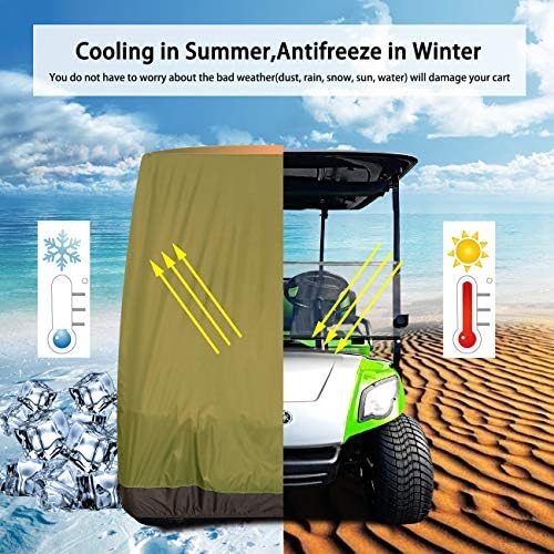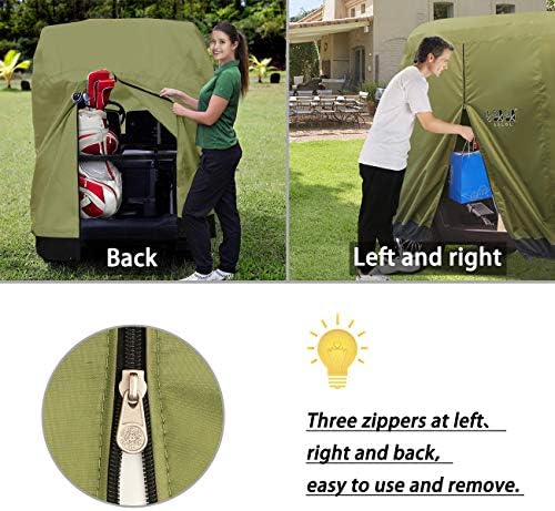 Covers for Golf Carts Well-Designed- Perfect Protection-Good Durability: The golf cart cover has a rear zipper and two side ziper open and velcro, vents in each of the 4 top corners. Use the high quantity thicken material polyester, tear-resistant and UV-resistant. Coated with PU water-proof layer inside to enhance the overall water-resistant.