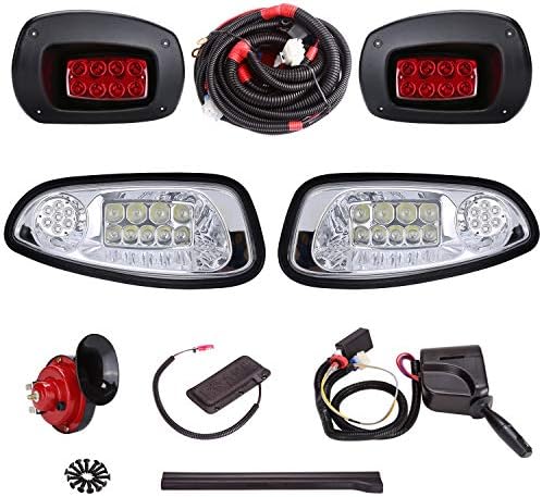 EZGO Light Package included : golf cart LED light kit AND golf cart universal deluxe light upgrade kit. 2x LED head lights, 2xLED tail lights, turn signals and switch, horn, brake lights, harness hardware and instruction.