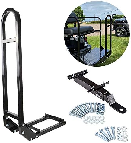 New Stylish U-shape Design: 10L0L Golf Cart Rear Seat Safety Grab Bar that mounts fully underneath footstep for more secure design, seat can fold down and has enough room without hitting the bar. The trailer hitch with receiver fits most golf cart rear seats on the market, Heavy duty steel 2″ Receiver, easy welding, attaches under rear foot platform.