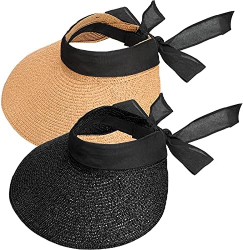 2 Pieces Women Wide Brim Sun Visor Hat Foldable Straw Hats for Summer UV Protection Roll-up Golf Visor Hat Summer Beach Hat