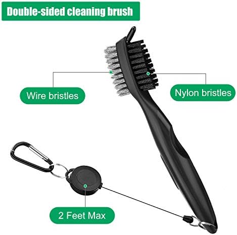 Retractable cleaning brush: the golf brush can wipe off tough dirt easily without leaving scratches, the nylon bristles for easy and quick cleaning of woods, and the wire bristles is ideal for cleaning tough dirt in grooves, retractable to be attached to the bag, easy for reach and use during the play