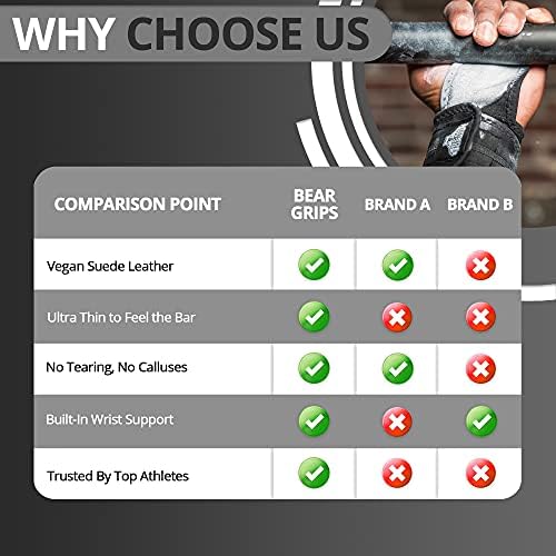 ? THE GOLDILOCKS OF GRIPS: Some grips are too stiff, some are too long, Bear Grips Suede Leather Grips are just right! They are pre-broken in, so they feel velvety soft right when you open them and are ready for action! They come in XS for the smallest of hands, all the way up to XL for our friends with big hands! And every size in between. So grab one or grab one for your gym buddy and feel the difference in your next workout!
