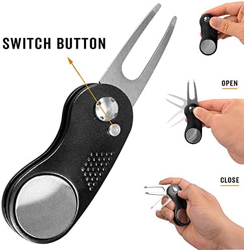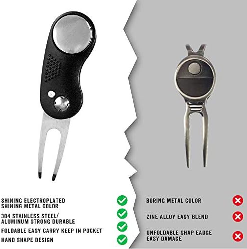 【Magnetic Ball Mark Divot Tool】 Foldable to avoid scratching in the pocket; a fixed button for effortless unfolding; Small & Lihtweight, easy to carry. The full-metal body 402 stainless steel and aluminum grip shell are helpful and useful for repairing lawns. The magnet golf ball marker is attached to the turf tool, easy push down to pop and reseat. The metal pick can also be used as a grooving cleaner to remove mud and debris from irons. Be the one who saved the golf course!