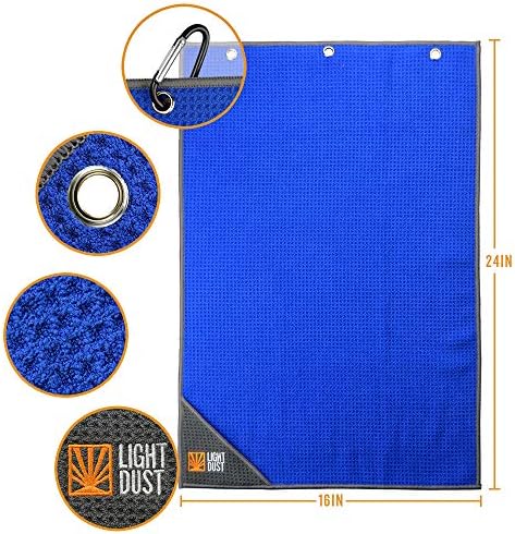 【Outstanding Absorbent Thick Towel】 Weight 127g, the LIGHT DUST golf cart towels are made of high density 100% superfine fiber which can effectively absorb moisture and dirt. The 24-inch x 16-inch tri-fold size is large enough to allow you to wrap and clean balls and clubs more efficiently. With the durable aluminum clips/carabiner, it can be easily attached to your golf bag and can prevent clips from loosening and towels from being lost. A great gift choice for golfers