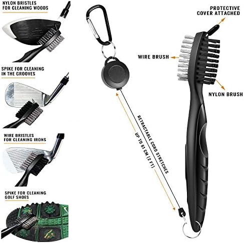 【3 in 1 Super Large Golf Brush Cleaner】 A Powerful brush that can easily wipe off hard dirt from any iron/wood golf club without scratches. This utility cleaner has a double-sided brush with nylon bristles on one side and hard metal on the other. The sharp pick on the top can remove tough dirt from grooves, shoe soles, golf clubs, shoe spikes, etc. The 2 feet retractable cord line can be secured to a school bag for easy carrying and use during the play
