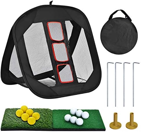 DURARANGE Pop-up Golf Chipping Net with Dual Turf Hitting Mat, 6 Driving Range Golf Balls, 6 Practice Foam Balls and Tees Combo, Target Swing Training Aids Backyard | Indoor | Outdoor
