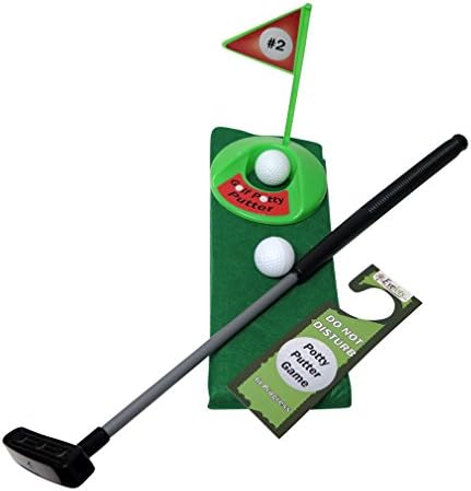 Make pee time tee time! When you get home after a long day, you want to chill a bit. Use your “private time” to perfect your putting with this potty putter toilet mini golf game. Buy one for yourself, and a second as the perfect novelty or gag gift for the golf lover, a funny office white elephant gift exchange, new husbands and dads, or that friend who has everything. Offers extra practice time with every trip to the bathroom. Why read the newspaper or look at phone when you can play golf. Perfect your technique on your “down” time. Also try using it for potty training. Note: for the sake of your marriage or to maintain pleasant roommate relations, please roll up and store putting green between practice sessions. Set includes putter, wraparound green, two balls, a hole with flag, and a Do Not Disturb card. Putter measures 25.5 inches length with 1 inch grip handle. Green measures 34 inches length x 28 inches Width, and extends approximately 24.5 inches from the toilet base. Includes do not disturb sign. Rated for ages 12 and up.
