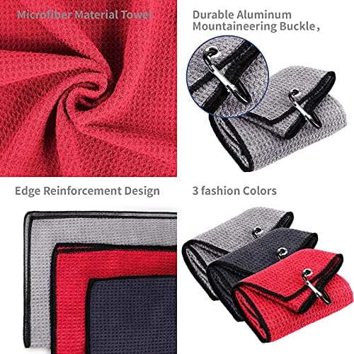 3 PACK GOLF TOWEL-In this set,you can get Tri-fold golf towels(16″ x 24″) in 3 colors-Black + Gray+ Red (Black Edging),3 pack golf towels allow you always have one as a backup. Take it with you to the course, one to keep moist and one to keep dry when you playing golf.