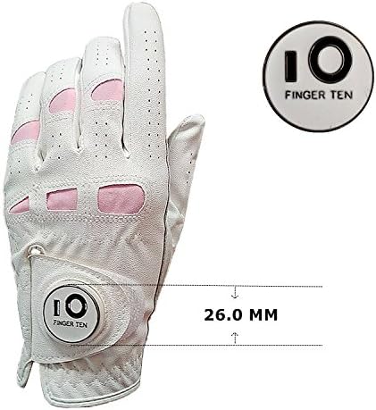 FINGER TEN Women’s Leather Golf Glove with Ball Marker Extra Grip 1 Pack, Left Right Hand Pink Fit Woman Girl, Size Small Medium Large XL