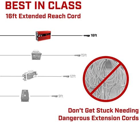 EXTENDED 16FT POWER CABLES – 16ft of reach leaves plenty of room to avoid the struggle of parking right next to an outlet or dangerously adding extension cords