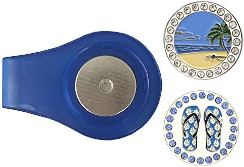ONE CLIP WITH TWO BLING GOLF BALL MARKERS – This golf ball marker clip combo comes with one translucent blue ball marker clip and two Beach themed ball markers: a Beach Scene and a Blue Flip Flops.