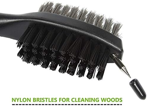Wire bristles for quick and efficient cleaning of irons while on the fairway. Nylon bristles for easy cleaning of woods and shoe spikes/cleats. Sharp pick for stubborn dirt and grime in grooves