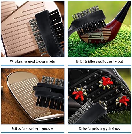 Practical And Ideal Golf Brush Tool: You will own 1 pcs 3 in 1 nylon bristles and steel wire bristles brush, 1 pcs golf club v-groove sharpener and 5 pcs golf tees for sharp pick for stubborn dirt and grime in grooves.