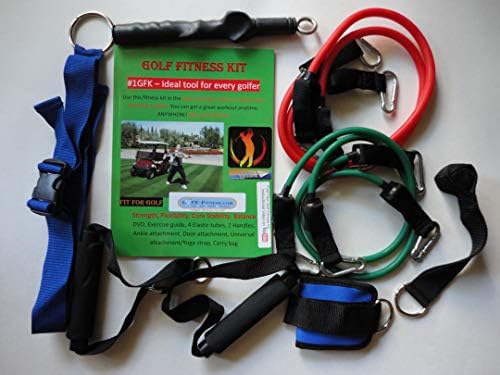 Sky Limit Fitness Products Golf Fitness Kit #1GFK – Golf Pro. Highest Quality Resistance Bands. This kit consists of: Exercise Guide, Instructional Video online, Molded Golf Fitness Grip,4 Resistance bands, 2 handles, Extra cushioned ankle attachment, Door Anchor, Universal Attachment/Yoga Strap, Carry bag , Use this kit in the Gym, Outside, Indoors or with your personal trainer. You can get great workouts anywhere. “Most Versatile Golf Fitness kit’