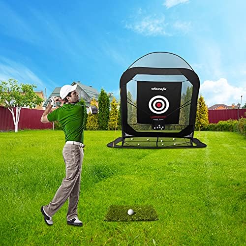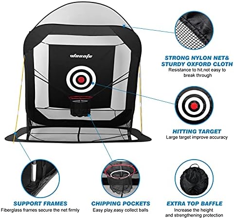 This wosofe golf hitting nets for backyard can be used on all your clubs with the real golf balls for driving, hitting, chipping practice. There is an automatic ball return system of the golf practice net, and an extra baffle on the top to improve the height of golf practice nets. This golf driving net can be used indoor, backyard, or outdoor for golf practice, which is easy to set up and fold, also convenient to take out. The golf driving nets heavy duty is a good choice for families to enjoy golf everywhere.