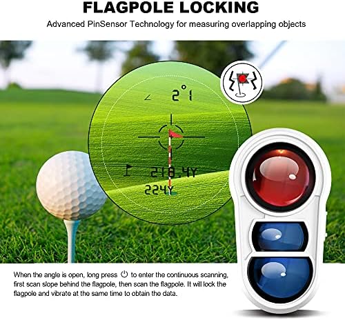 Long press the “Action” button to enter scanning mode. Aim at the background first and move towards the flagpole, it will trigger a vibration when the flagpole is locked. The golf rangefinder can lock a flagstick up to 250 Yards away.