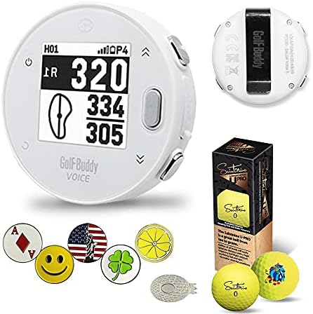 GolfBuddy Voice X GPS/Rangefinder Bundle with 5 Ball Markers, 1 Magnetic Hat Clip and Saintnine 2 Ball Sleeve … (White)