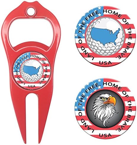 Hat Trick Openers 6-in-1 Golf Divot Tool & Poker Chip Marker Set with USA Logo, Red