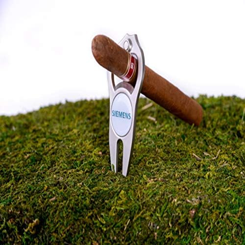 Made in USA golf divot repair tool which incorporates divot fixer, magnetic ball marker, bottle opener with magnetic cap catcher, cigar holder, club rest, and can tab opener