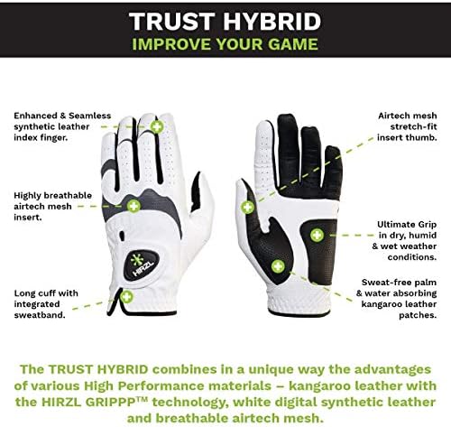 HIRZL Trust Hybrid Golf Gloves– All Weather Mens Golf Glove (White/Black) | Nylon, Kangaroo Leather, Polyester | Ultimate Grip (Wet or Dry), Ergonomic Fit, Breathable, Sweat Free, Water Repellent