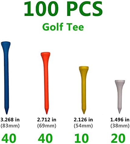 ❺、 A pack of golf tee, a combination of various colors and heights in bulk. 100pcs: 4 colors/4 sizes/quantity (blue / 3.268 in (83mm) / 40pcs; orange / 2.712 in (69mm) / 40pcs; yellow / 2.126 in (54mm) / 10pcs; white / 1.496 in (38mm) / 20pcs).