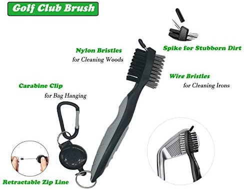 GOLF CLUB BRUSH: Club Brush with Brass bristles for cleaning irons. Soft Nylon bristles for cleaning woods. Sharp pick for tough dirt in grooves.2 Ft Retractable zip-line can be attached to the bag and easy for reach and use during the play.