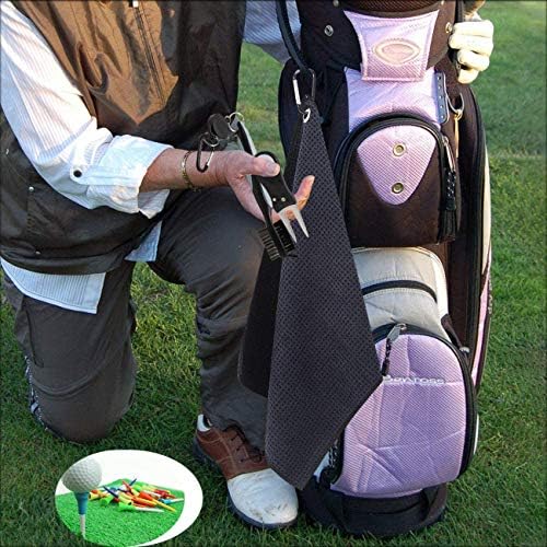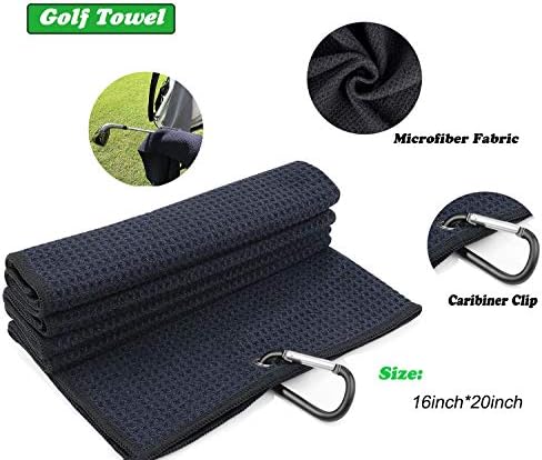 GOLF TOWEL: Size 16” x 20”. Microfiber with waffle design removes dirt, mud, sand and grass better than cotton towels, and it absorbs less water than cotton, easier to wash and carry.With a heavy duty aluminum clip/carabiner that conveniently attaches to your golf bags.