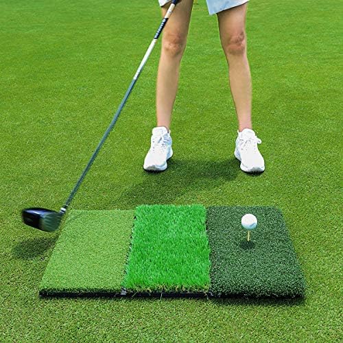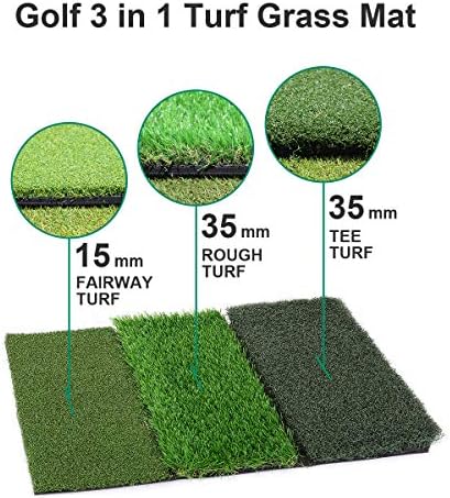 ▶【PORTABLE TRI TURF GOLF PRACTICE MAT】3 different surfaces provide more comprehensive golf training in your backyard. ✮Tee Box – Short cut and neatly groomed turf. Hit balls directly off of the turf or stick a real tee in like you’re driving off of a real tee box.✮ Rough – Longer cut turf to simulate hitting out of the rough. Great to practice with your irons and wedges! ✮Fairway – Short cut grass to simulate a well-groomed fairway. Practice hitting irons and hybrids from this clean cut