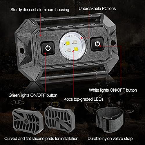 OPERATE CONVENIENTLY – Equipped with durable nylon velcro strap, curved and flat rubber pads, you can used it at curved and plat place by rubber pads, besides, it also can be mounted on roll bar by the velcro strap, installation and removal are very convenient, no additional tools required. The switch button and the work light are integrated, the white light and green light have independent ON/OFF switch buttons, it is super convenient and does not take up space.