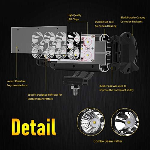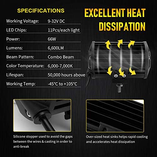 SUPER BRIGHT – 5inch LED pods have built-in high intensity 22pcs cree chips. Unique triple row design with clear PC lens allow led light bar give out 6000k super bright white light, producing up to 66w & 6,600 lumens. Provide clear visibility and safe driving experience at night.