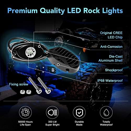 LED Rock Lights Harnessing The Power Of Four Pods Rock light Containing (3 pcs CREE Leds Each), Perfect For Illuminating Your Undercarriage. Original Truck Interior Lights CREE LED Chip, More Brighter, Longer Life Span for 50000hrs.